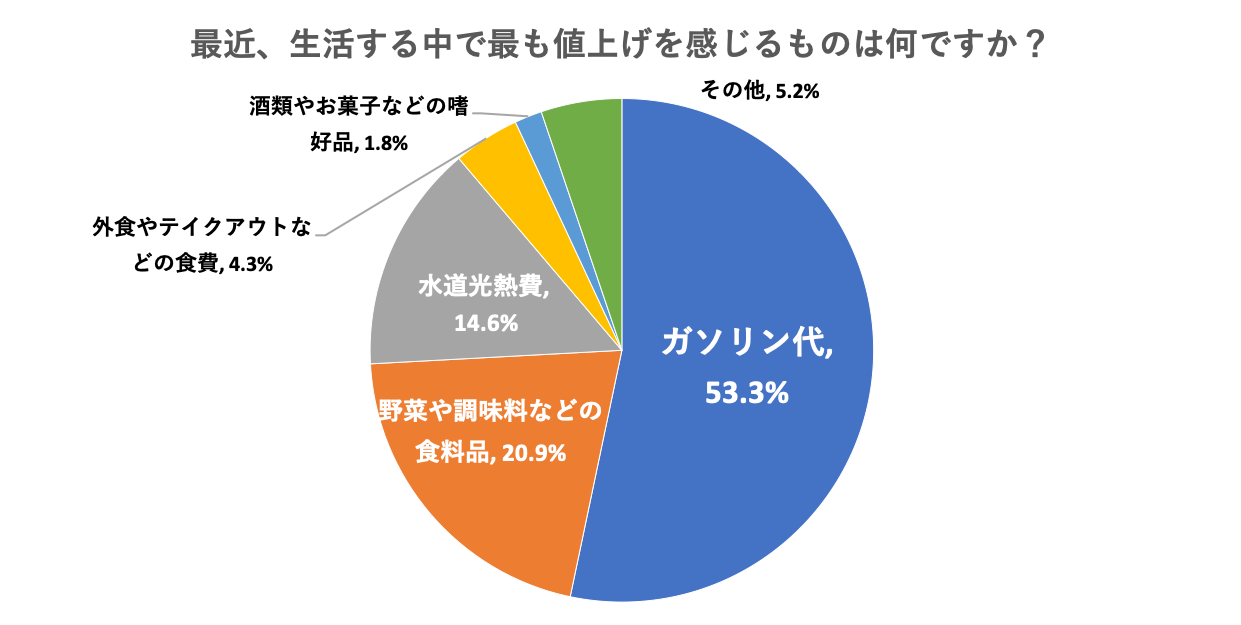 最近生活する中で最も値上げを感じるものについて聞いたところ「ガソリン代(53.3%)」の回答が最も多く、半数以上を占める結果となりました。次いで「野菜や調味料などの食料品(20.9%)」「水道光熱費(14.6%)」と日常生活にかかる費用で値上げを感じている方が多いことがわかりました。