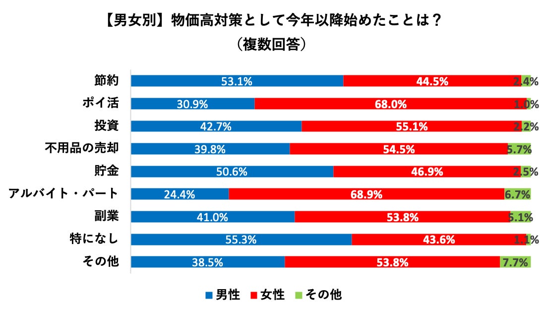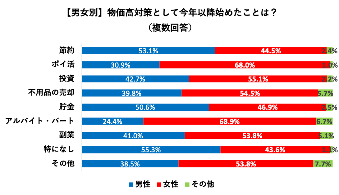 一方で「ポイ活」「アルバイト・パート」に関しては回答した60%以上が女性となっており、男性は出費を抑える一方で女性は収入を増やす傾向が伺えました。