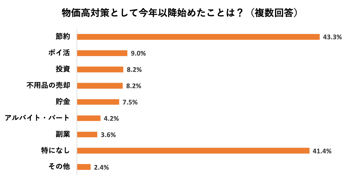 ・物価高対策として今年に入ってから「節約」を始めたと43.3%が回答。男女別では男性は出費を抑える一方で女性は収入を増やす傾向