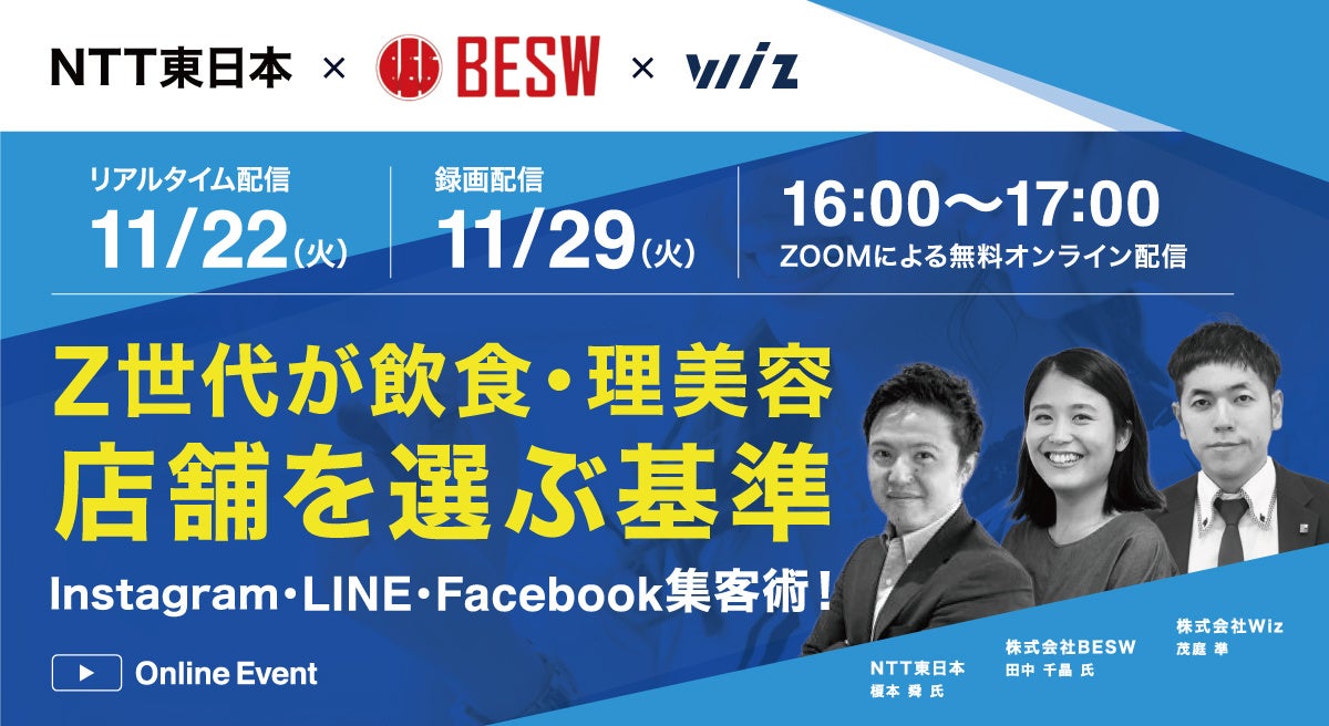 11月22日(火)、11月29日(火)※、株式会社Wizは、【NTT東日本 営業推進本部営業部第一営業部門 榎本 舜 氏】【BESW 代表取締役 田中 千晶 氏】をお迎えして、「Z世代が飲食・理美容店舗を選ぶ基準」についてお伝えするウェビナーを開催します。