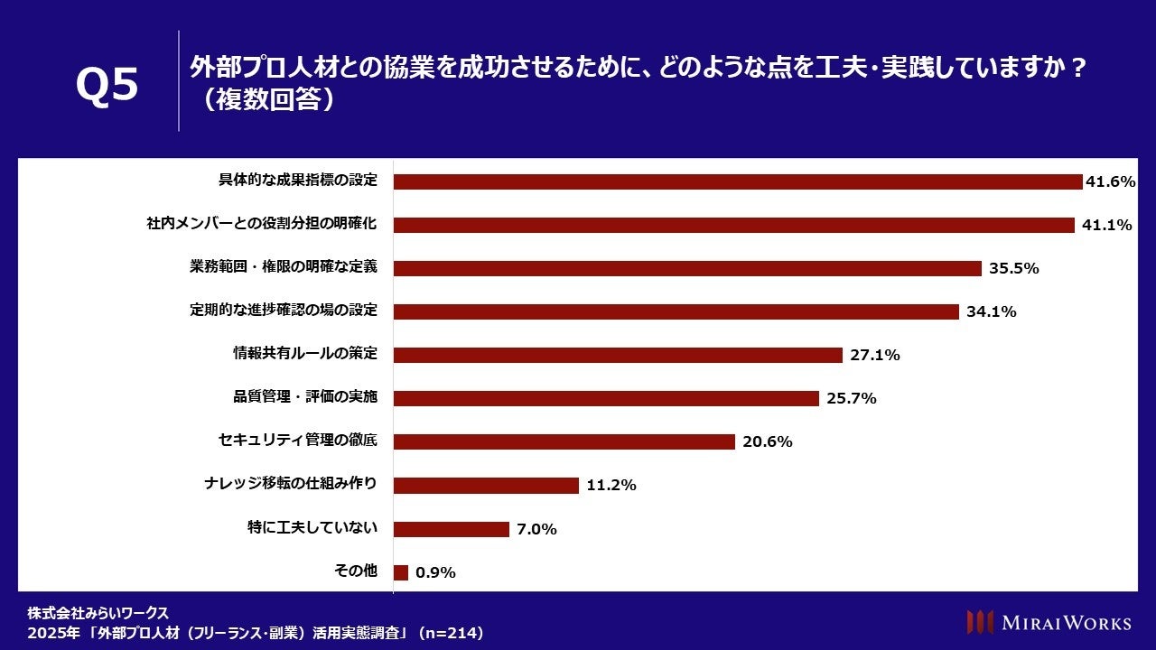 外部プロ人材を活用したことが「ある」とお答えされた方に、「Q5.外部プロ人材との協業を成功させるために、どのような点を工夫・実践していますか?」(n=214)と質問したところ、「具体的な成果指標の設定」が41.6%、「社内メンバーとの役割分担の明確化」が41.1%、「業務範囲・権限の明確な定義」が35.5%という回答となりました。