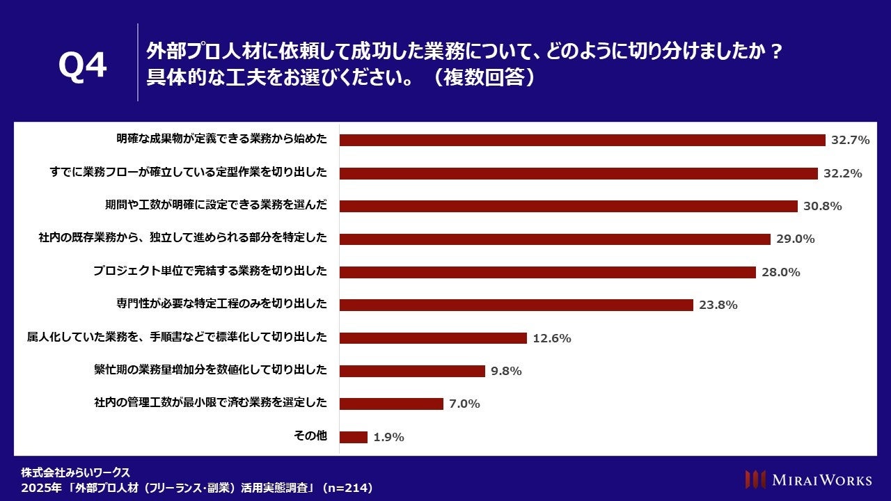 外部プロ人材を活用したことが「ある」とお答えされた方に、「Q4. 外部プロ人材に依頼して成功した業務について、どのように切り分けましたか?具体的な工夫をお選びください。」(n=214)と質問したところ、「明確な成果物が定義できる業務から始めた」が32.7%、「すでに業務フローが確立している定型作業を切り出した」が32.2%、「期間や工数が明確に設定できる業務を選んだ」が30.8%という回答となりました。