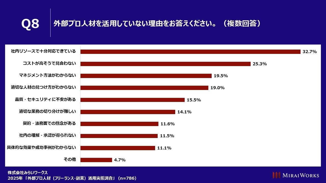 外部プロ人材を活用したことが「ない」とお答えされた方に、「Q8. 外部プロ人材(フリーランス、副業人材等)を活用していない理由をお答えください。(複数回答)」(n=786)と質問したところ、「社内リソースで十分対応できている」が32.7%、「コストが高そうで見合わない」が25.3%、「マネジメント方法がわからない」19.5%という回答となりました。