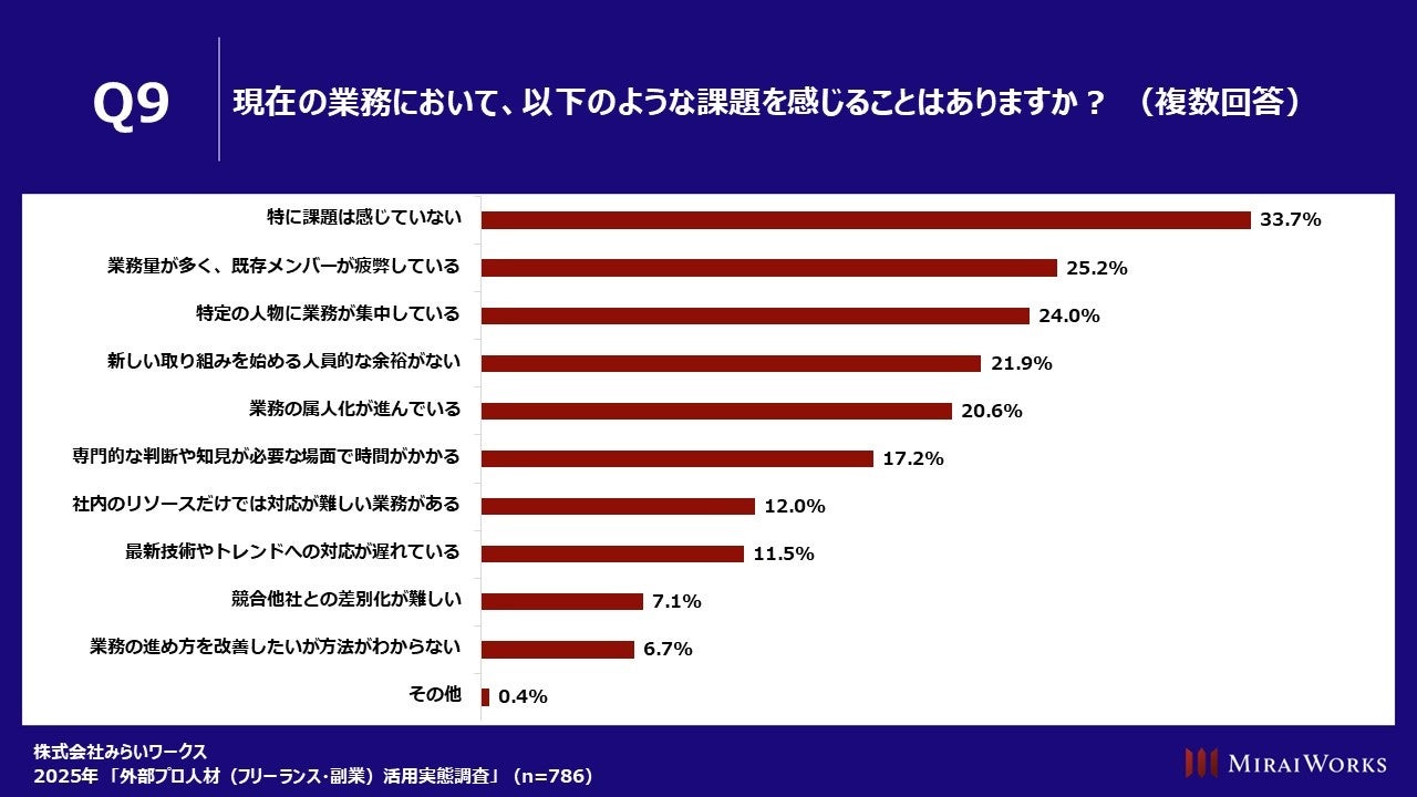外部プロ人材を活用したことが「ない」とお答えされた方に、「Q9.現在の業務において、以下のような課題を感じることはありますか?(複数回答)」(n=786)と質問したところ、「特に課題は感じていない」が33.7%で最も多かったです。一方で、「業務量が多く、既存メンバーが疲弊している」が25.2%、「特定の人物に業務が集中している」が24.0%という回答が次いで多かったです。