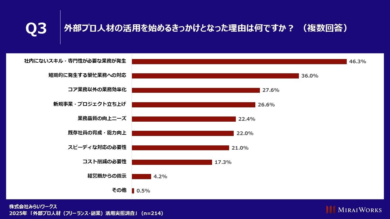 ■ 外部プロ人材の活用のきっかけは、「社内にないスキル・専門性が必要な業務が発生」や「短期的に発生する繁忙業務への対応」など