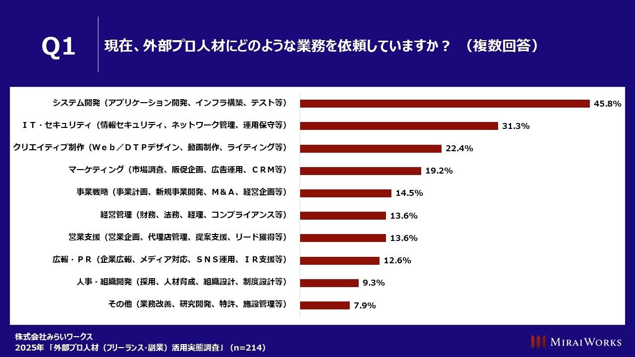 外部のプロ人材を活用したことが「ある」とお答えされた方に、「Q1. 現在、外部プロ人材にどのような業務を依頼していますか?(複数回答)」(n=214)と質問したところ、「システム開発(アプリケーション開発、インフラ構築、テスト等)」が45.8%で最も多く、次いで「IT・セキュリティ(情報セキュリティ、ネットワーク管理、運用保守等)」が31.3%という回答となりました。
