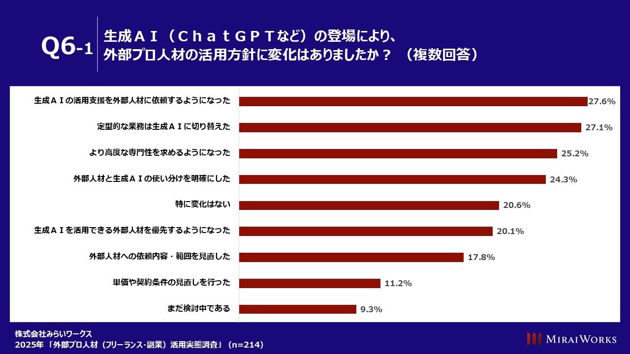 外部プロ人材を活用したことが「ある」とお答えされた方に、「Q6. 生成AI(ChatGPTなど)の登場により、外部プロ人材の活用方針に変化はありましたか?」(n=214)と質問したところ、「生成AIの活用支援を外部人材に依頼するようになった」が27.6 %、「定型的な業務は生成AIに切り替えた」が27.1 %、「より高度な専門性を求めるようになった」が25.2 %という回答となりました。
