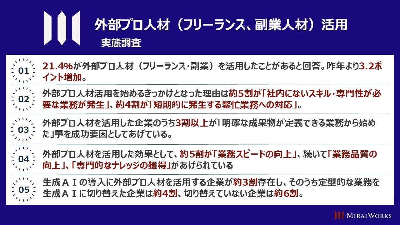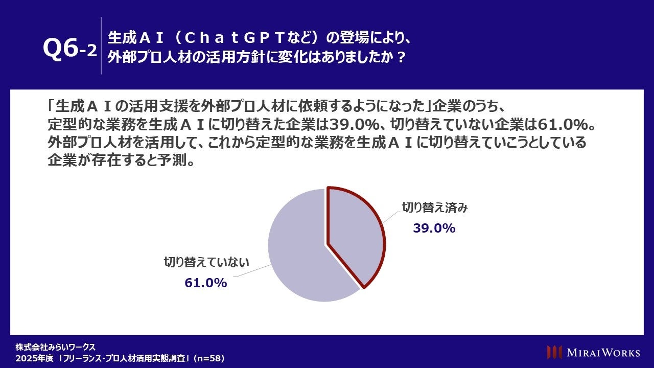 昨年度に引き続き、システム開発やITセキュリティ、クリエイティブ制作などで外部プロ人材活用をしている企業が多いことがわかりました。また、新しい特徴として、生成AIが登場し、生成AIの導入に外部プロ人材を活用する企業が約3割存在し、そのうち定型的な業務を生成AIに切り替えた企業は約4割、切り替えていない企業は約6割と、生成AIの活用支援を外部人材に依頼し、定型業務を生成AIに既に切り替えた企業とこれから切り替えていこうとしている企業が存在すると予測されます。