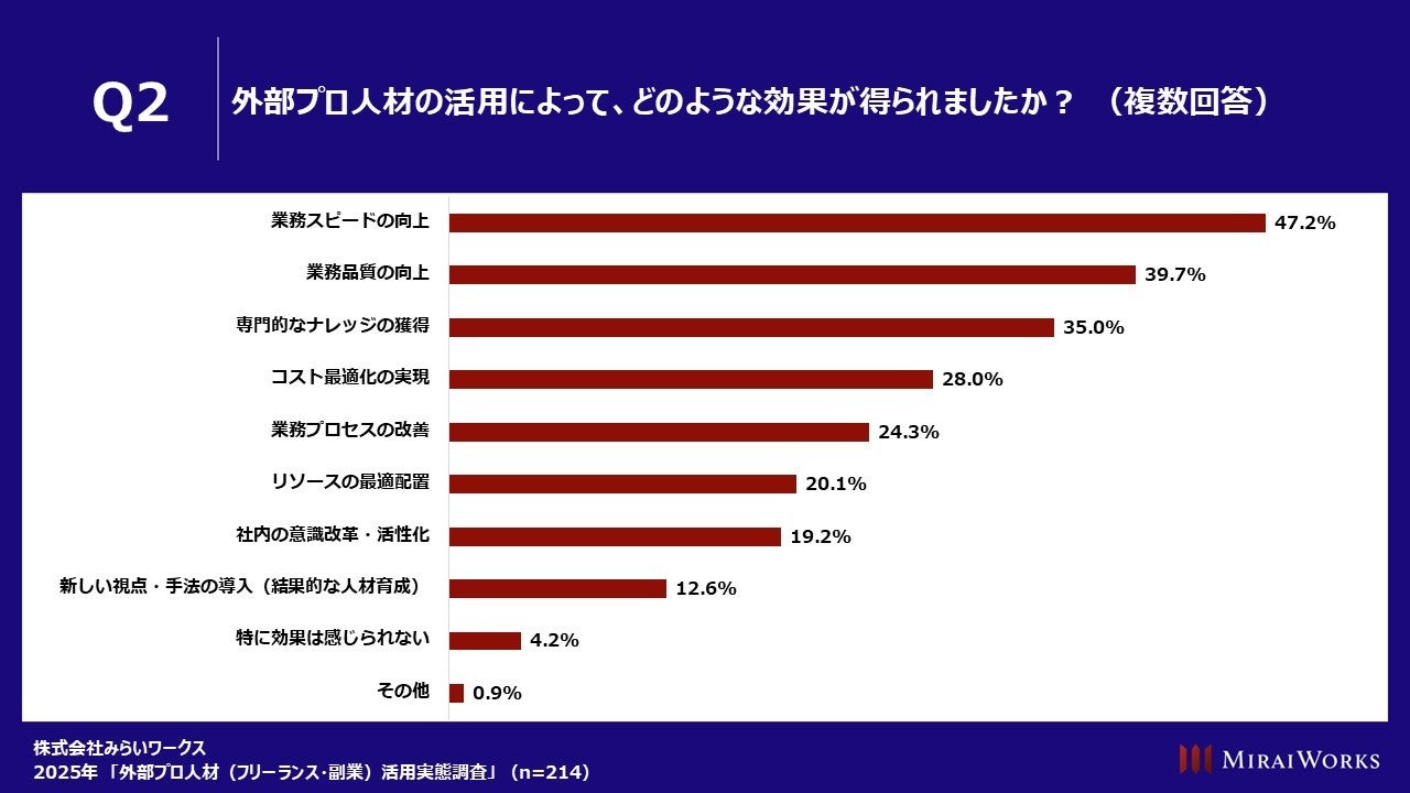 ■ 外部プロ人材の活用により得られる効果は、「業務スピードの向上」が47.2%で最多