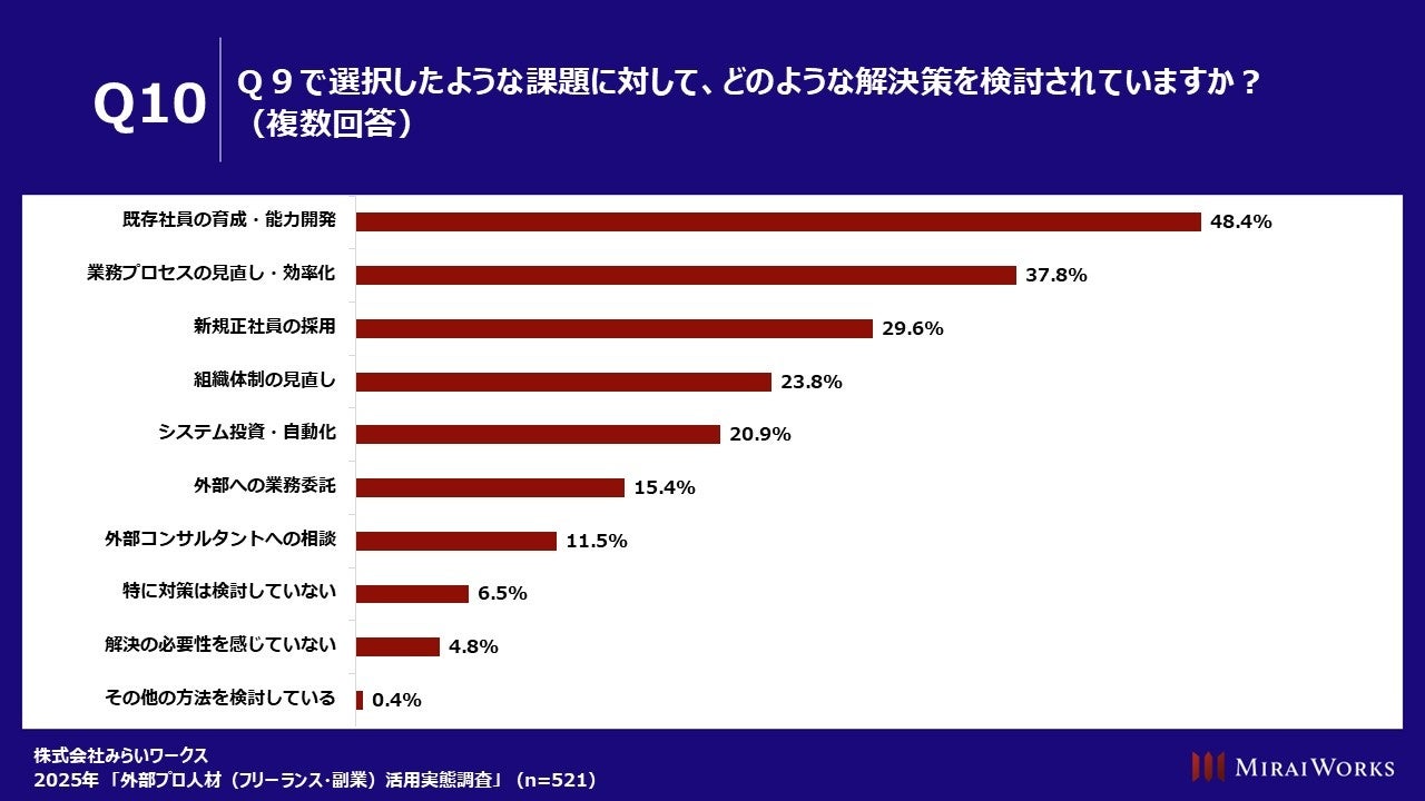 外部プロ人材を活用したことが「ない」かつ、Q9で「特に課題は感じていない」以外をお答えされた方に、「Q10. Q9で選択したような課題に対して、どのような解決策を検討されていますか?」(n=521)と質問したところ、「既存社員の育成・能力開発」が48.4%、「業務プロセスの見直し・効率化」が37.8%、「新規正社員の採用」が29.6%という回答となりました。
