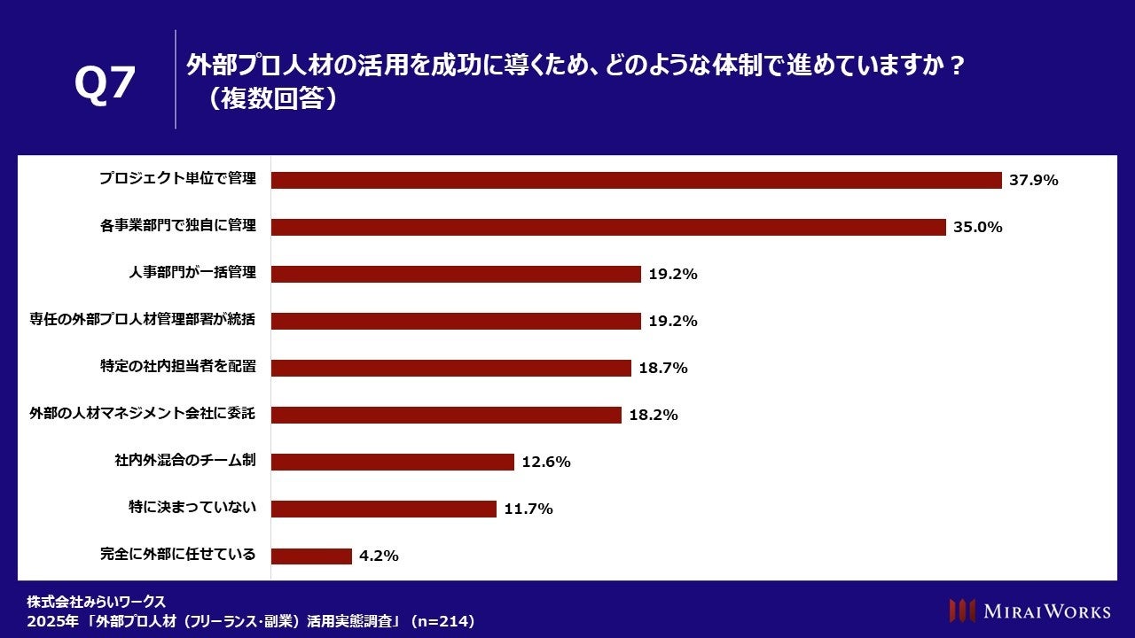 外部プロ人材を活用したことが「ある」とお答えされた方に、「Q7.外部プロ人材の活用を成功に導くため、どのような体制で進めていますか?(複数回答)」(n=214)と質問したところ、「プロジェクト単位で管理」が37.9%、「各事業部門で独自に管理」が35.0%、「人事部門が一括管理」「専任の外部プロ人材管理部署が統括」がそれぞれ19.2%という回答となりました。