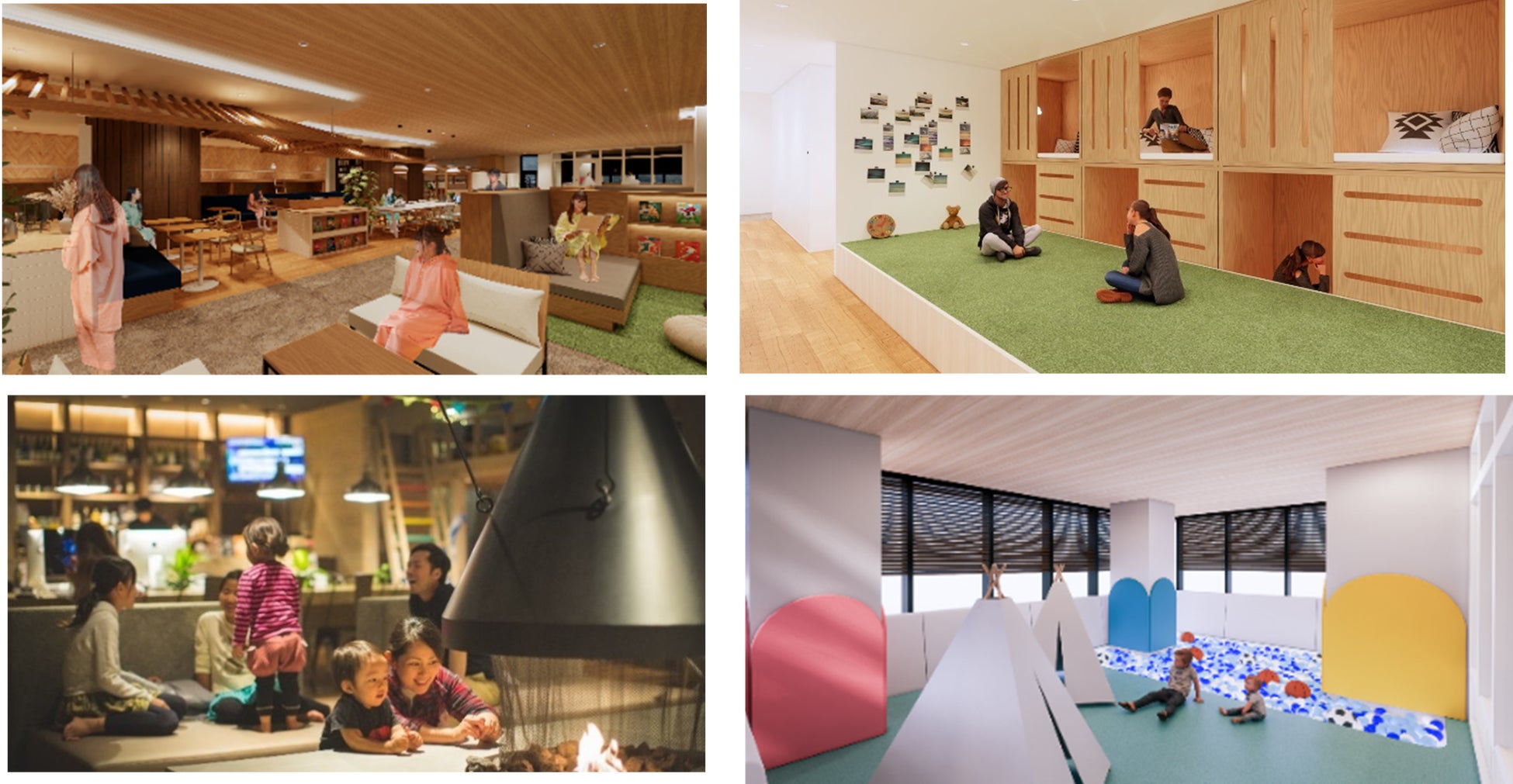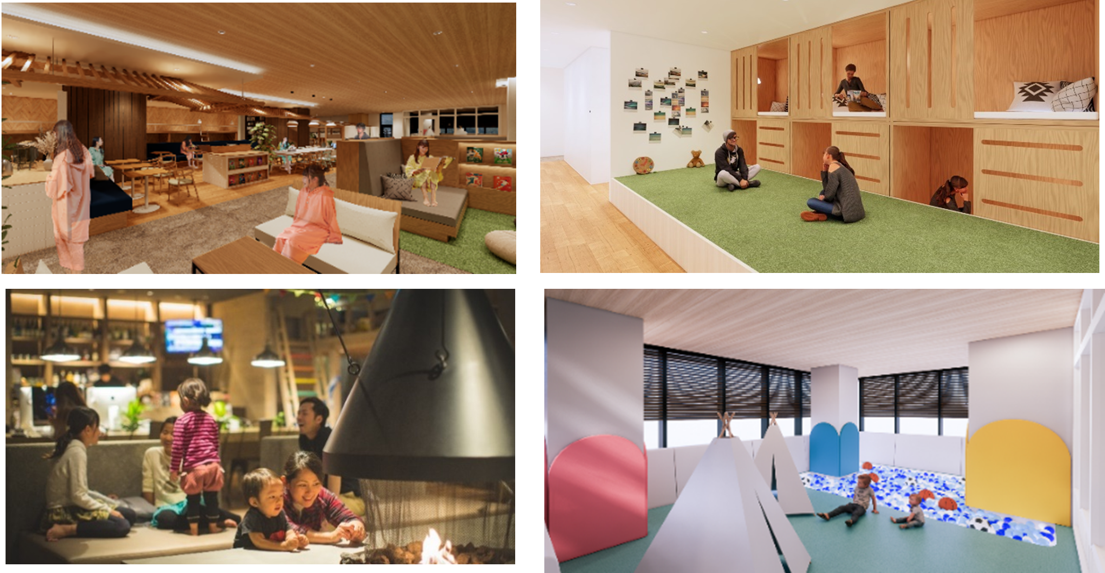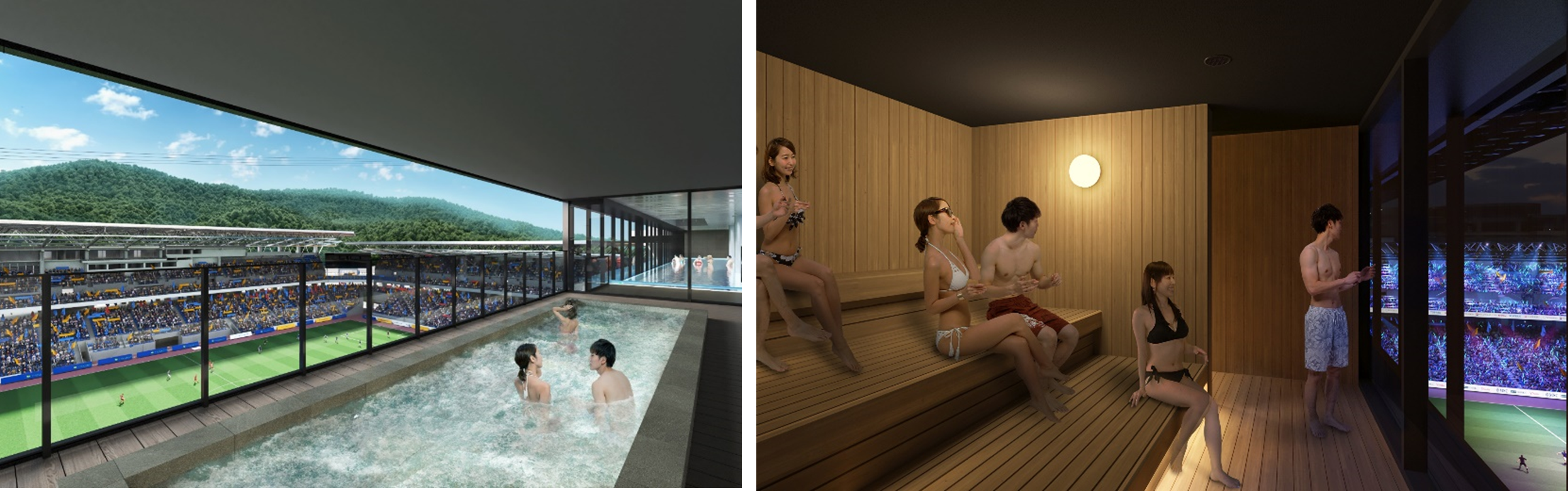 北欧風リラクゼーションエリアでくつろげる商業棟、日本初のサッカースタジアムビューサウナが楽しめるホテル棟
