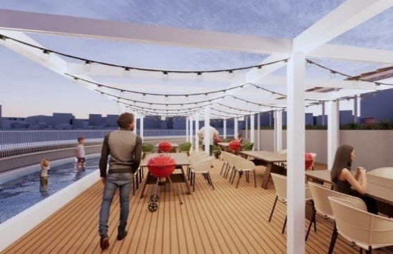 商業棟の屋上階は開放エリアになっており、無料で足湯を利用いただけます。長崎の美しい山並みを一望できるフォトジェニックなスポットで、憩いの場所や、観光の新たな目的地となることを見込んでいます。