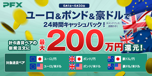 パートナーズFX「 ポンド/円・ポンド/米ドル・ユーロ/円・ユーロ/米ドル・豪ドル/円・豪ドル/米ドル」における新規お取引数量の合計に対して、上限200万円までキャッシュバックするキャンペーンを実施いたします。