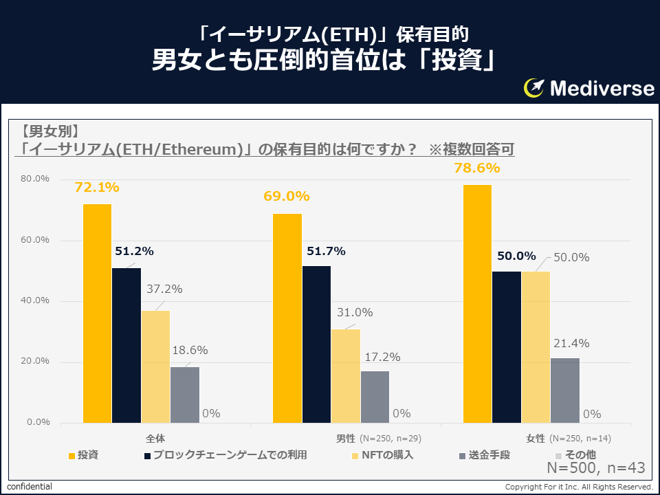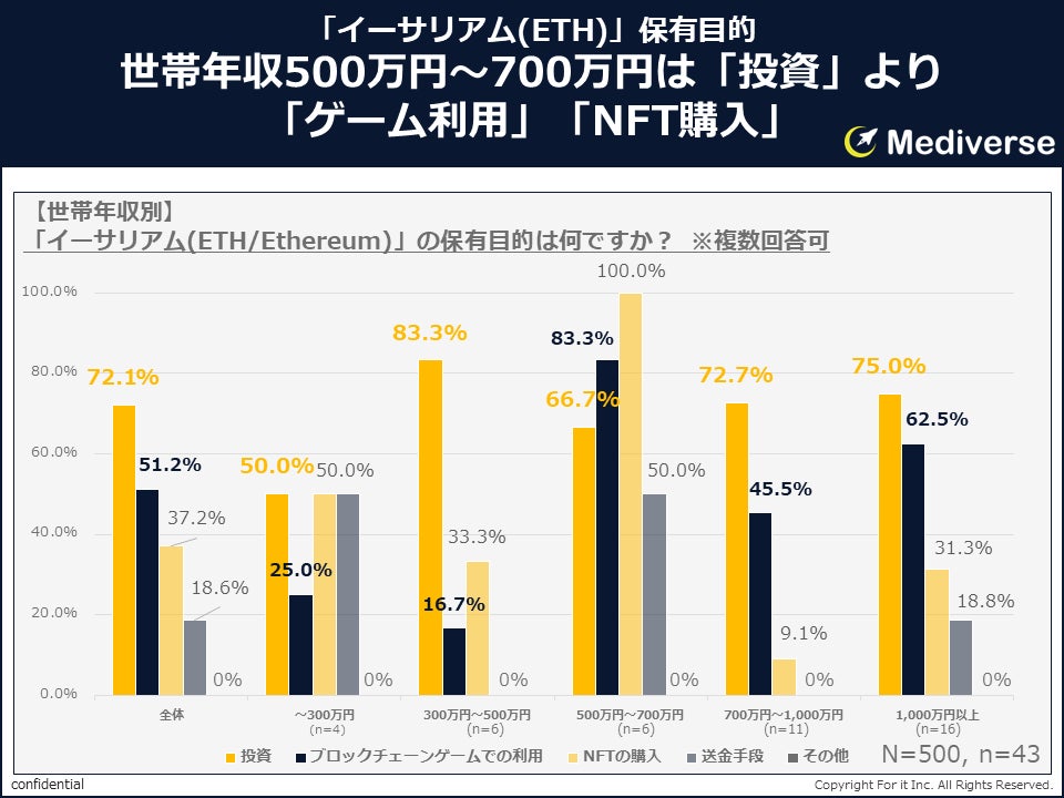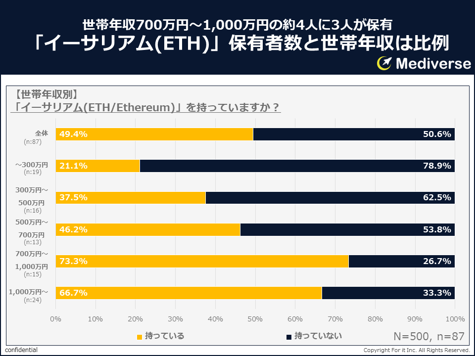 また、「イーサリアム(ETH)」の保有率や保有目的には、性別よりも年代や世帯年収が大きく影響していることが明らかになりました。