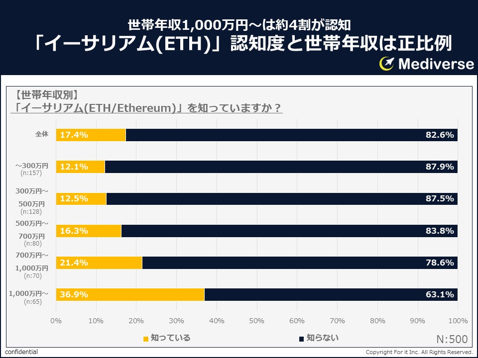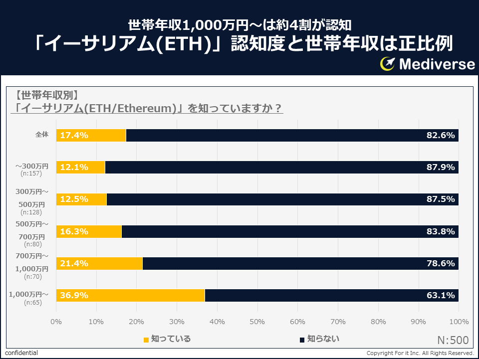 世帯年収別に見ると、「イーサリアム(ETH)」認知度は世帯年収と見事に比例していた。300万円未満と1,000万円以上の世帯年収層には、その認知度に3倍以上の差異が見られた。