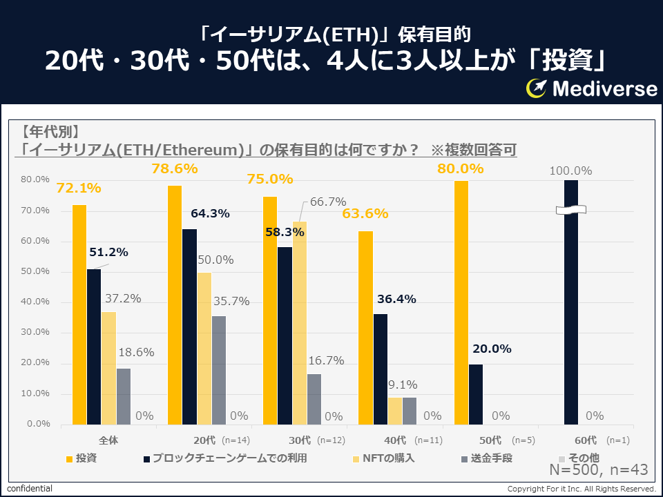 年代別に見ると、「イーサリアム(ETH)」の保有目的は、60代を除く全ての年代において、「投資」がもっとも多く、20代・30代・50代においては約8割を占めていた。