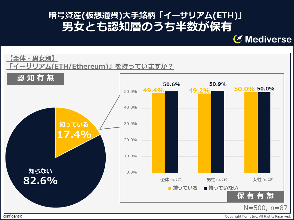 「イーサリアム(ETH)」を知っていると回答した17.4%のうち、実際に約半数の49.4%が保有していることがわかった。また、保有率において、ジェンダー差はほとんど見られなかった。