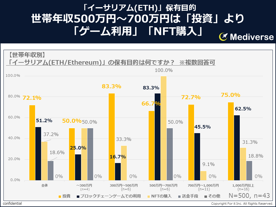 世帯年収別に見ると、世帯年収500万円~700万円の層を除き、「イーサリアム(ETH)」の保有目的は、「投資」が主流となっていた。こちらの年収層は、「投資」より「ブロックチェーンゲームでの利用」「NFTの購入」が大きく上回っている他、「送金手段」を含め、いずれの項目も全体的に高い回答率となっていたのが、特徴的である。