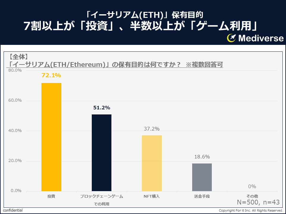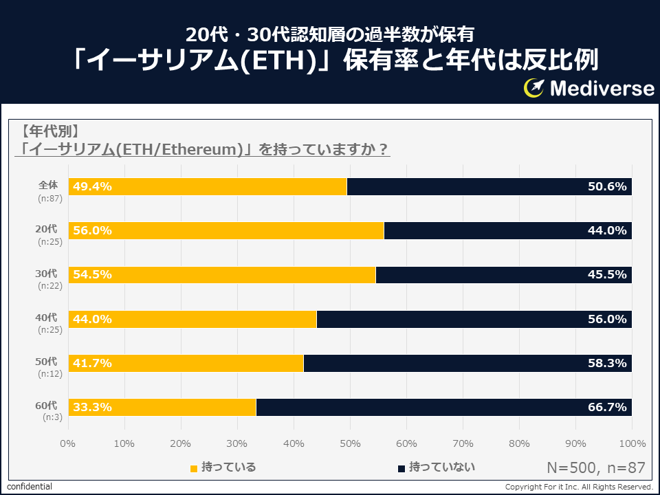 今回のアンケート調査結果では、「イーサリアム(ETH)」の国内における認知度は20%未満に留まっていたものの、認知層のほぼ半数(49.4%)が保有していることが判明いたしました。