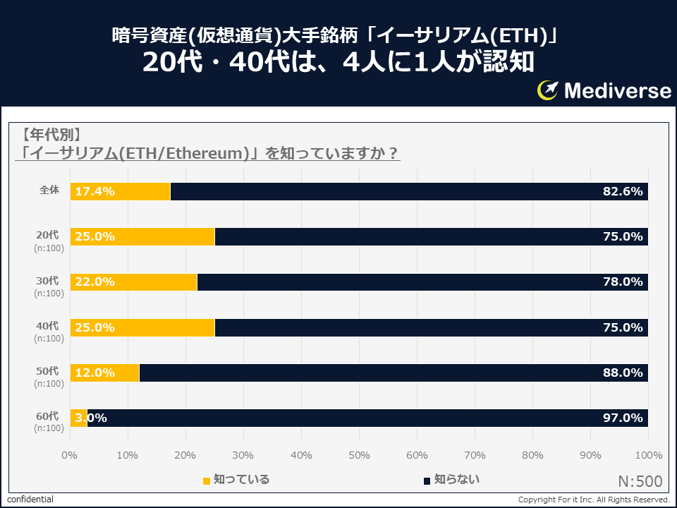 年代別に見ると、20代・40代の4人に1人は「イーサリアム(ETH)」を認知している一方で、50代の認知はその半分となっており、60代に至ってはわずか3.0%に留まっていた。
