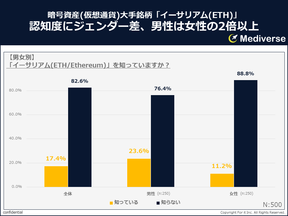 男女別に見ると、「イーサリアム(ETH)」認知度にはジェンダー差が見られており、男性は女性の2倍以上が認知していた。