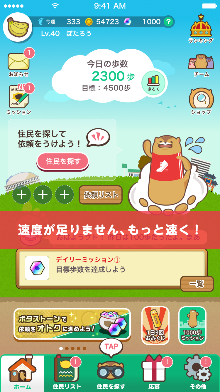 規定の速度に達しないと、HOME画面では「速度が足りません、もっと速く!」という注意喚起のメッセージと、けたたましいアラート音で、ユーザーへランニングを促します。