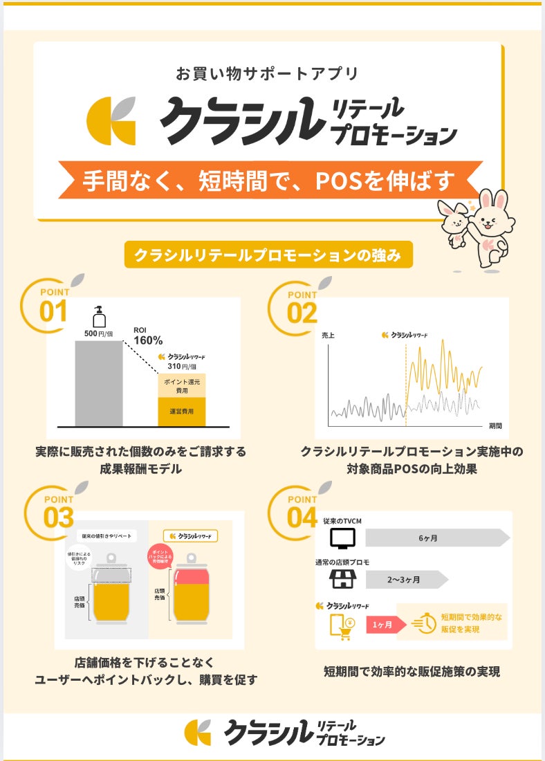 「クラシルリワード」にメーカー様・小売様指定の商品を掲載し、消費者はレシートをアップロードすることによってポイントが獲得できる仕組みとなっており、店頭での売価を変えずにPOSアップが実現可能です。
