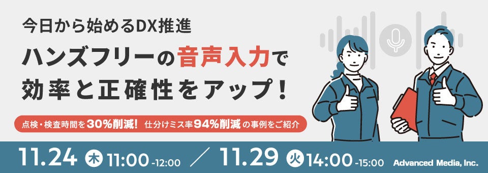2022年11月24日(木)・11月29日(火)、株式会社アドバンスト・メディア(本社:東京都豊島区、代表取締役会長兼社長:鈴木清幸 以下、アドバンスト・メディア)は、オンラインセミナー「今日から始めるDX推進 ハンズフリーの音声入力で効率と正確性をアップ!~点検・検査時間を30%削減/仕分けミス率94%削減の事例をご紹介~」を開催いたします。