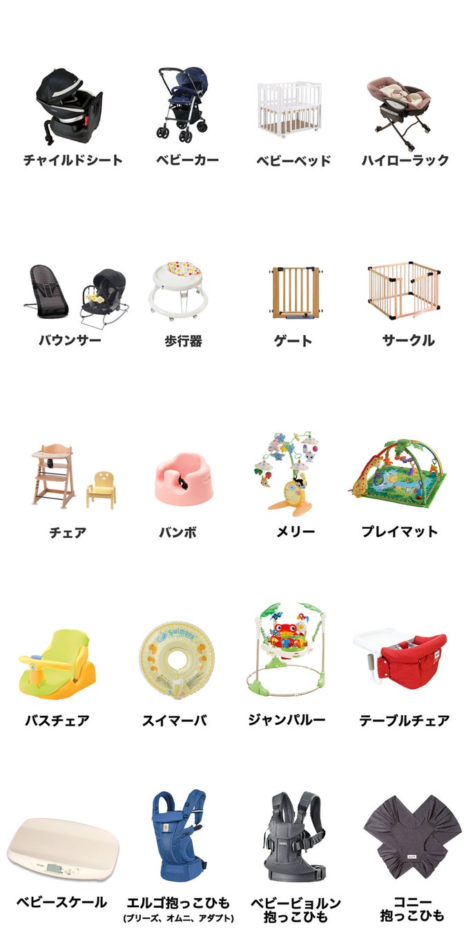 | 対象アイテム | チャイルドシート、ベビーカー、ハイローラック、ベビーベッド、バウンサー、歩行器、ゲート、サークル、チェア、バンボ、メリー、プレイマット、バスチェア、スイマーバ、ジャンパルー、テーブルチェア、ベビースケール、抱っこひも(エルゴブリーズ、オムニ、アダプト、ベビービョルン、コニー) |