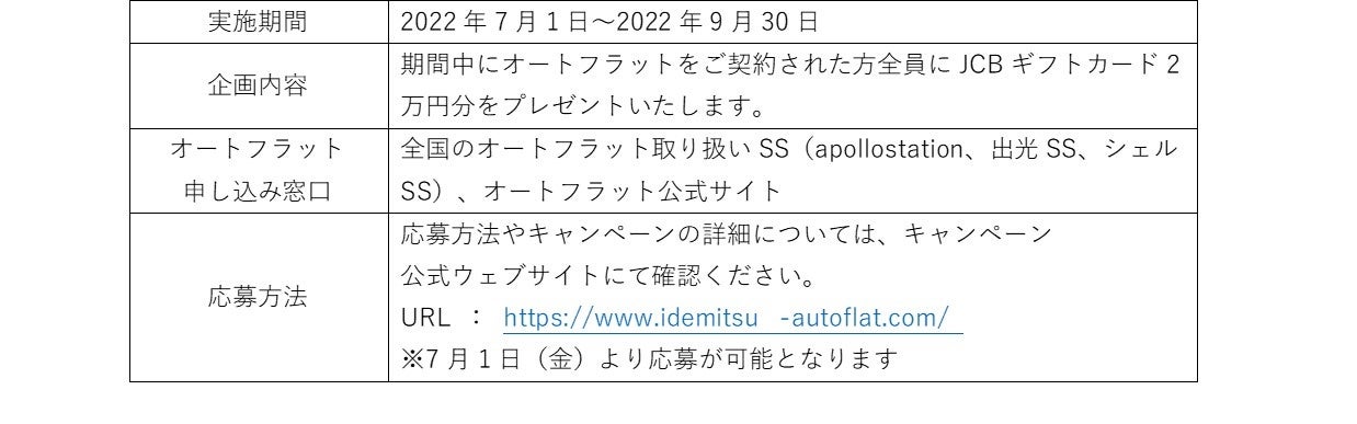 出光興産株式会社(本社:東京都千代田区、代表取締役社長:木藤 俊一、以下 当社)は、月々定額で新車に乗れるマイカーリース「オートフラット」において、7月1日(金)より「新車購入応援キャンペーン」を実施いたします。キャンペーン期間中(7月1日~9月30日)にオートフラットをご契約いただいたすべてのお客様に、「JCBギフトカード2万円分」をもれなくプレゼントいたします。全国の当社系列のサービスステーション(以下SS)、およびオートフラット公式サイトにて取り扱いを実施いたします。