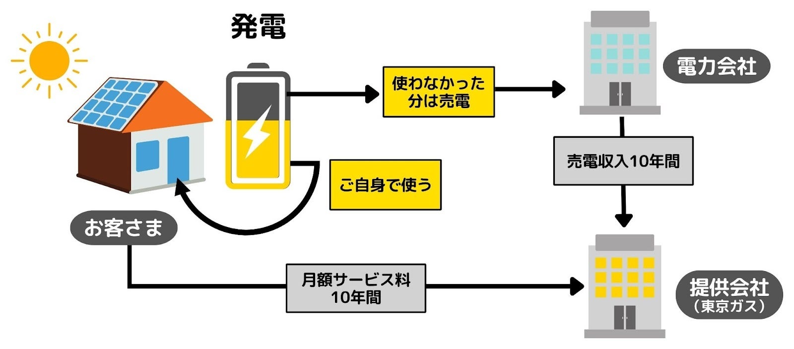 ※2:ご家庭でご利用されずに余った電気は電力会社に売電されます。10年間の契約期間中、売電により得られる収入は東京ガスに譲渡いただきます。契約終了後、売電により得られる収入はお客様のものとなります。