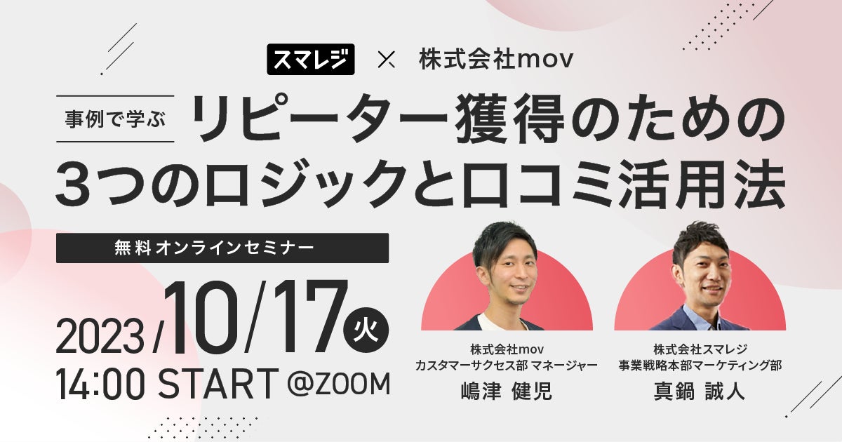そこで本ウェビナーでは、「店舗データや口コミを活用したリピート顧客獲得のコツ」をテーマに、POSレジを通じて顧客の販売履歴データを活用し店舗運営の支援を行う『スマレジ』と、口コミを活用した集客支援を行う『口コミコム 』の2社でセミナーを開催いたします。
