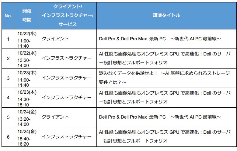 さらに、30分ごとに開催するブース講演では、PCブランド刷新の概要やクライアント新製品の特長、AI基盤の根底を支えるストレージ基盤の重要性、AI時代の新たなDCインフラ像など、様々なテーマについて各担当者よりご説明します。
