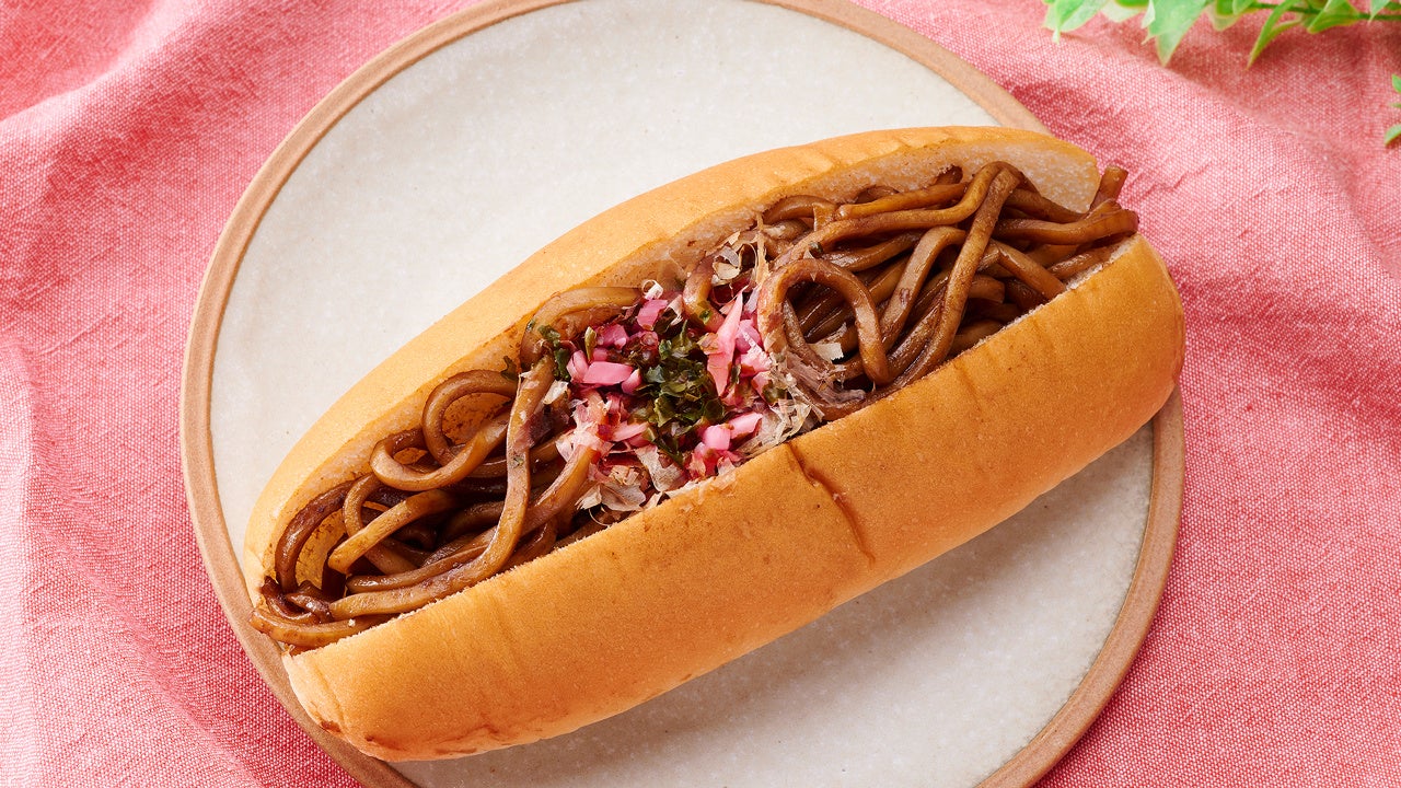 お店一番人気の「まるしょう特製ソース焼きそば」をイメージした焼きそばをサンドしました。