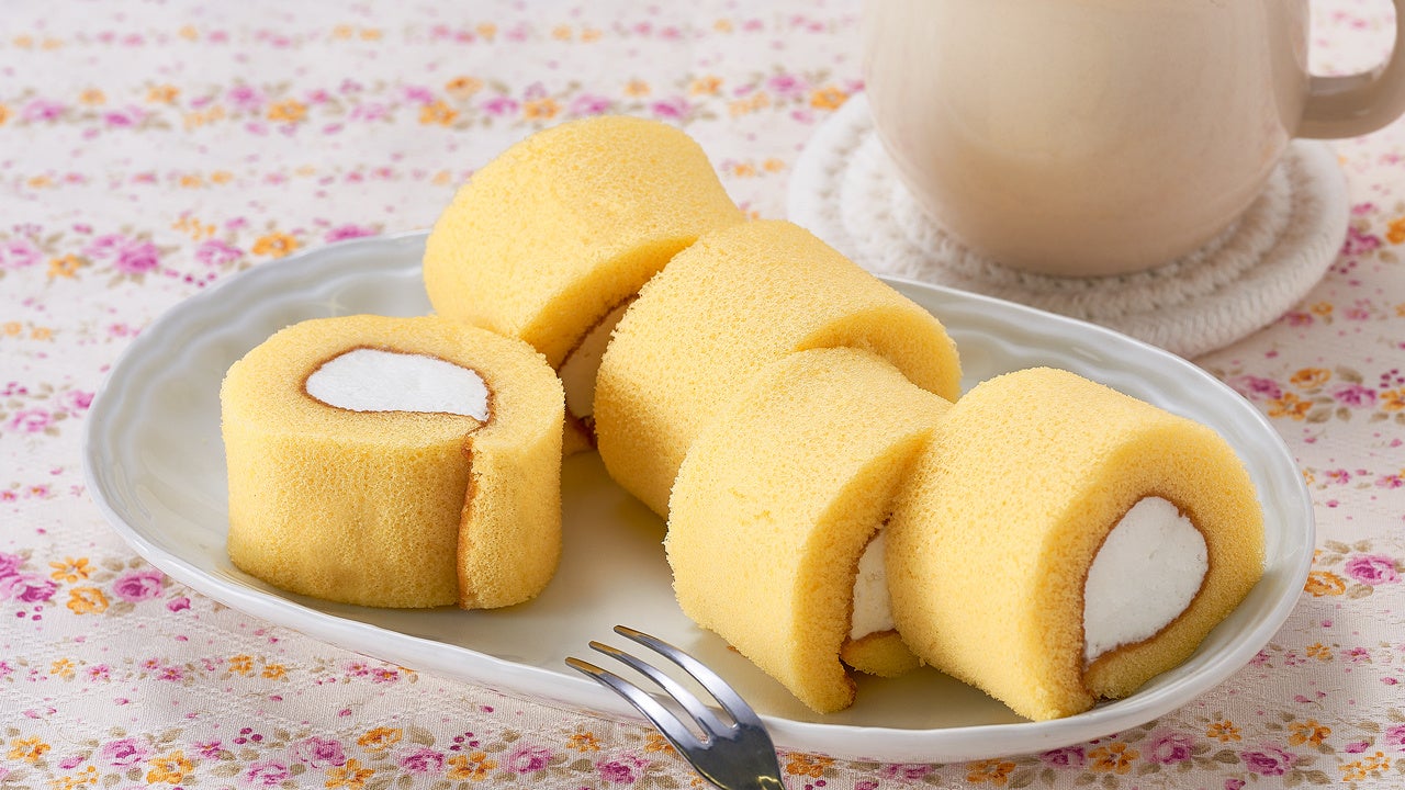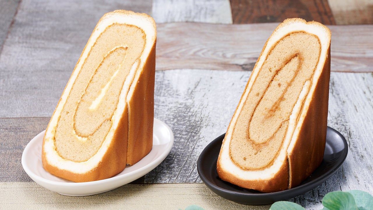 カスタードクリームを巻いたキャラメル風味のスポンジケーキ、コーヒークリームを巻いたコーヒー風味のスポンジケーキ。