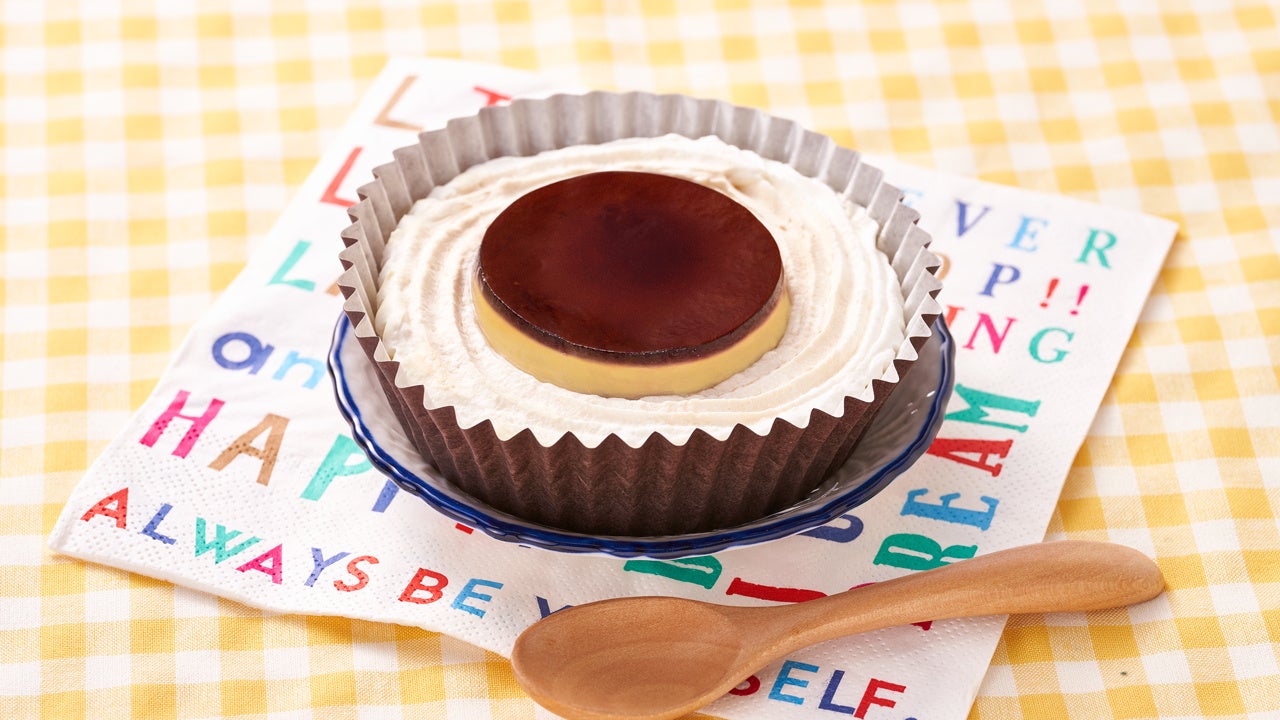 スポンジケーキの上にプリンをトッピングし、ホイップクリームを絞りました。