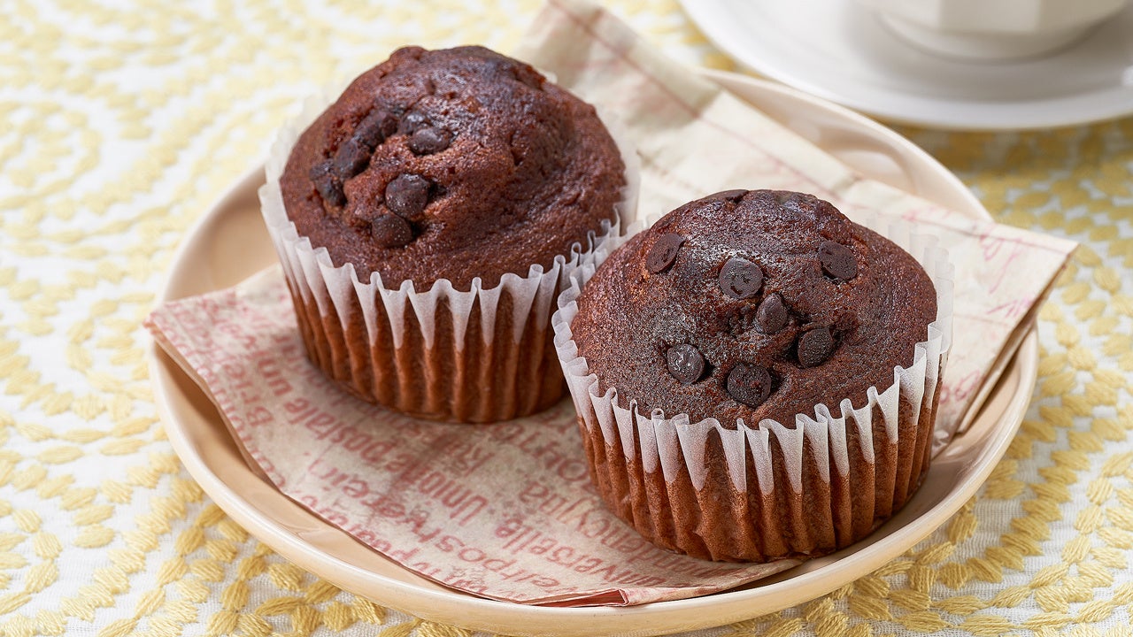 ほんのりビターなチョコマフィンにチョコチップをトッピングして焼き上げました。