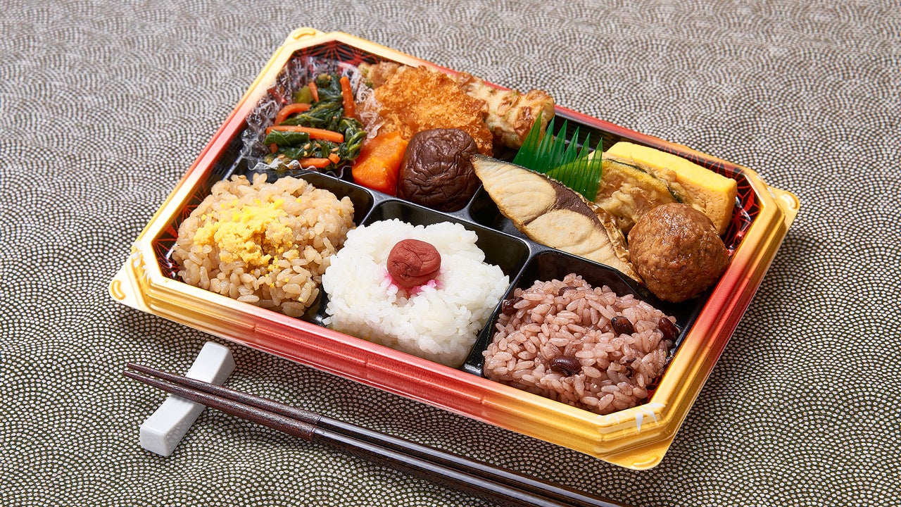 3色のご飯(白飯・茶飯・赤飯)に、彩りのあるおかずを盛付けました。