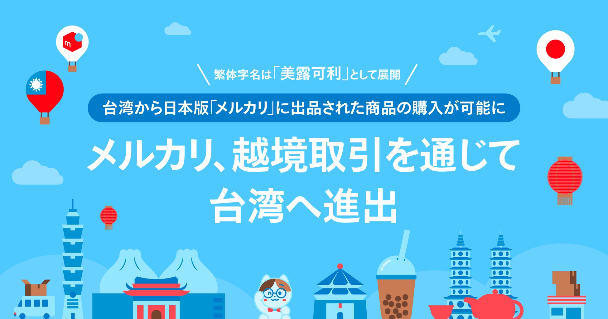 株式会社メルカリ(以下:メルカリ)は、2024年8月29日より、グローバル戦略の一環として「越境取引」を通じて台湾へ進出いたしますので、お知らせいたします。本日より台湾に在住のお客さまは、「メルカリ」に会員登録し、Web版「メルカリ」を通じて日本で出品された商品を購入することが可能となります。さらに、台湾現地向けのコミュニーケーション強化のため繁体字名「美露可利」(読み方、メルカリ)を使用いたします。