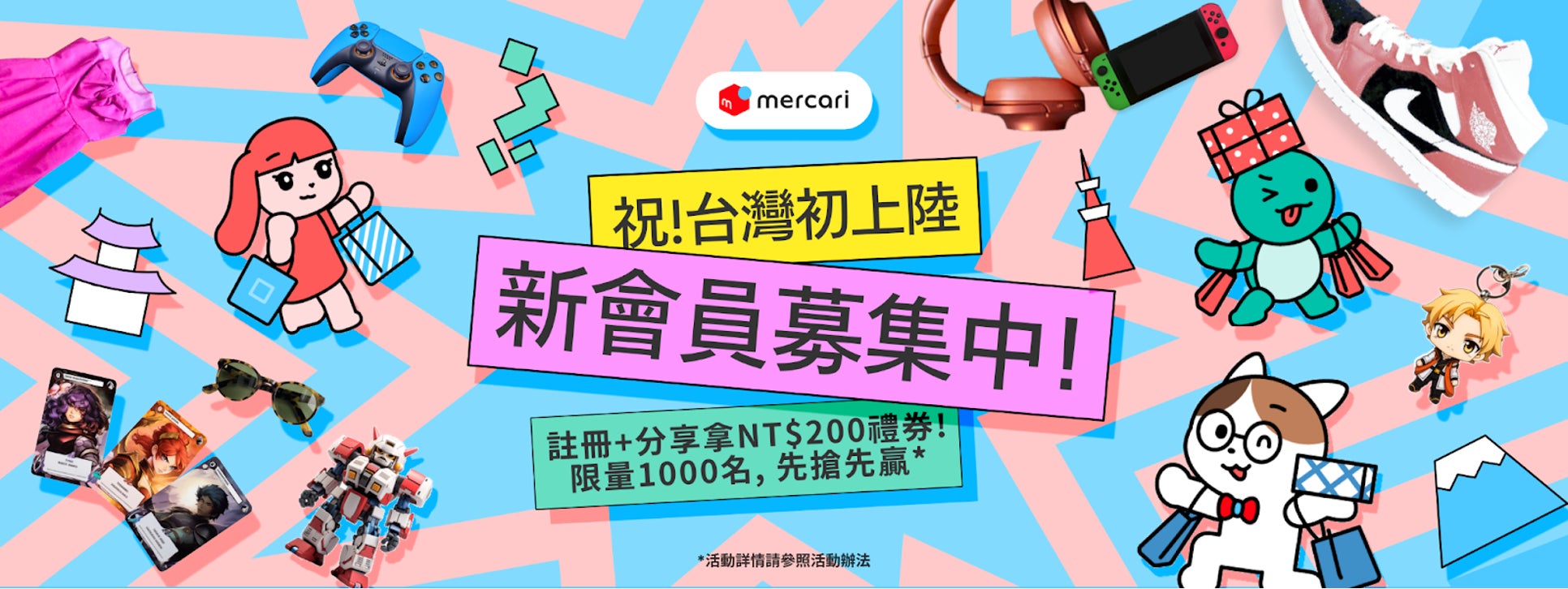 台湾でのサービス提供開始を記念し、2024年8月29日から9月9日までの期間中に「メルカリ」に会員登録し、指定された条件をクリアした最初の1,000名のお客さまには、最大200台湾ドルに値するギフトカードがプレゼントされます。