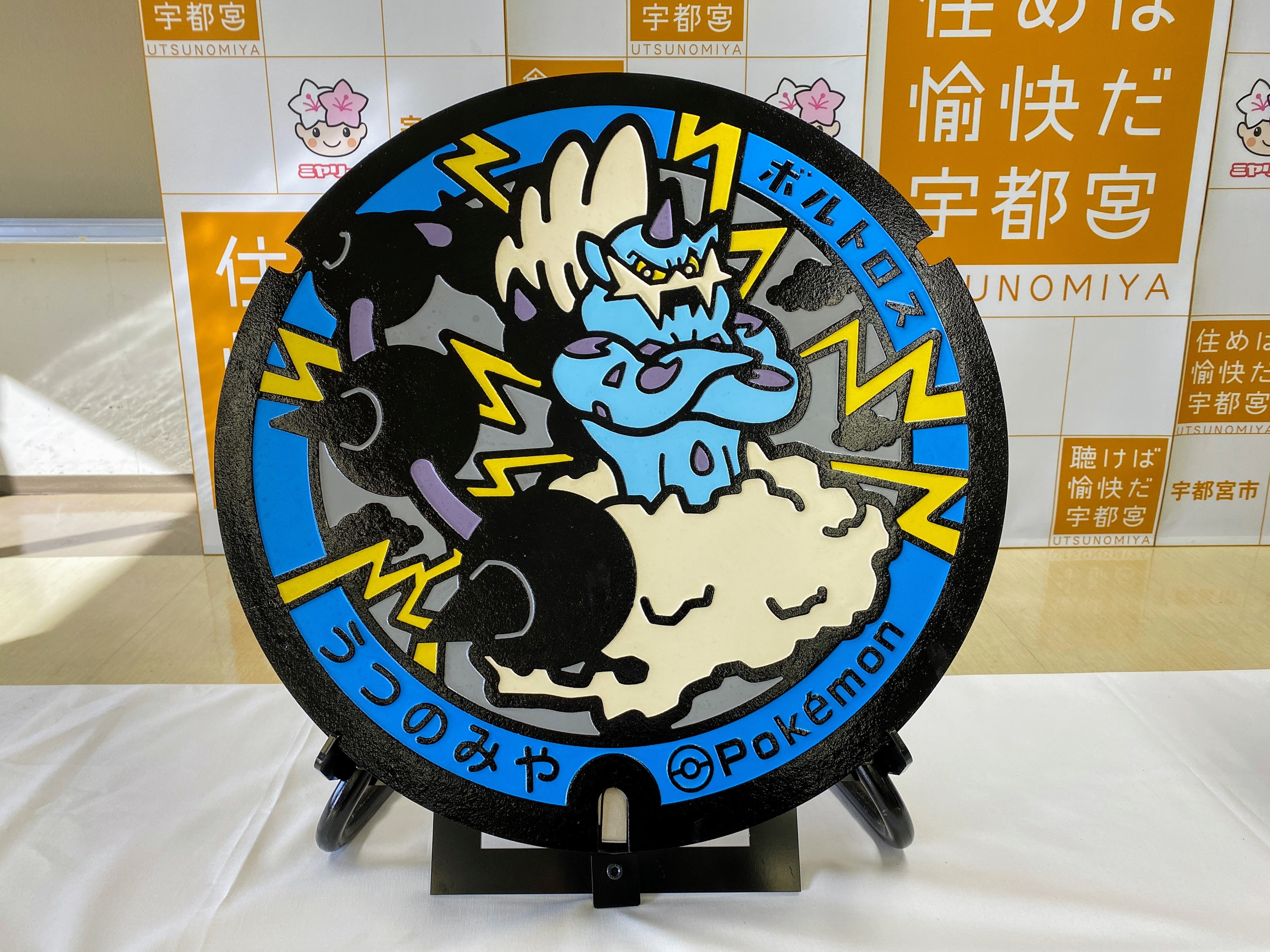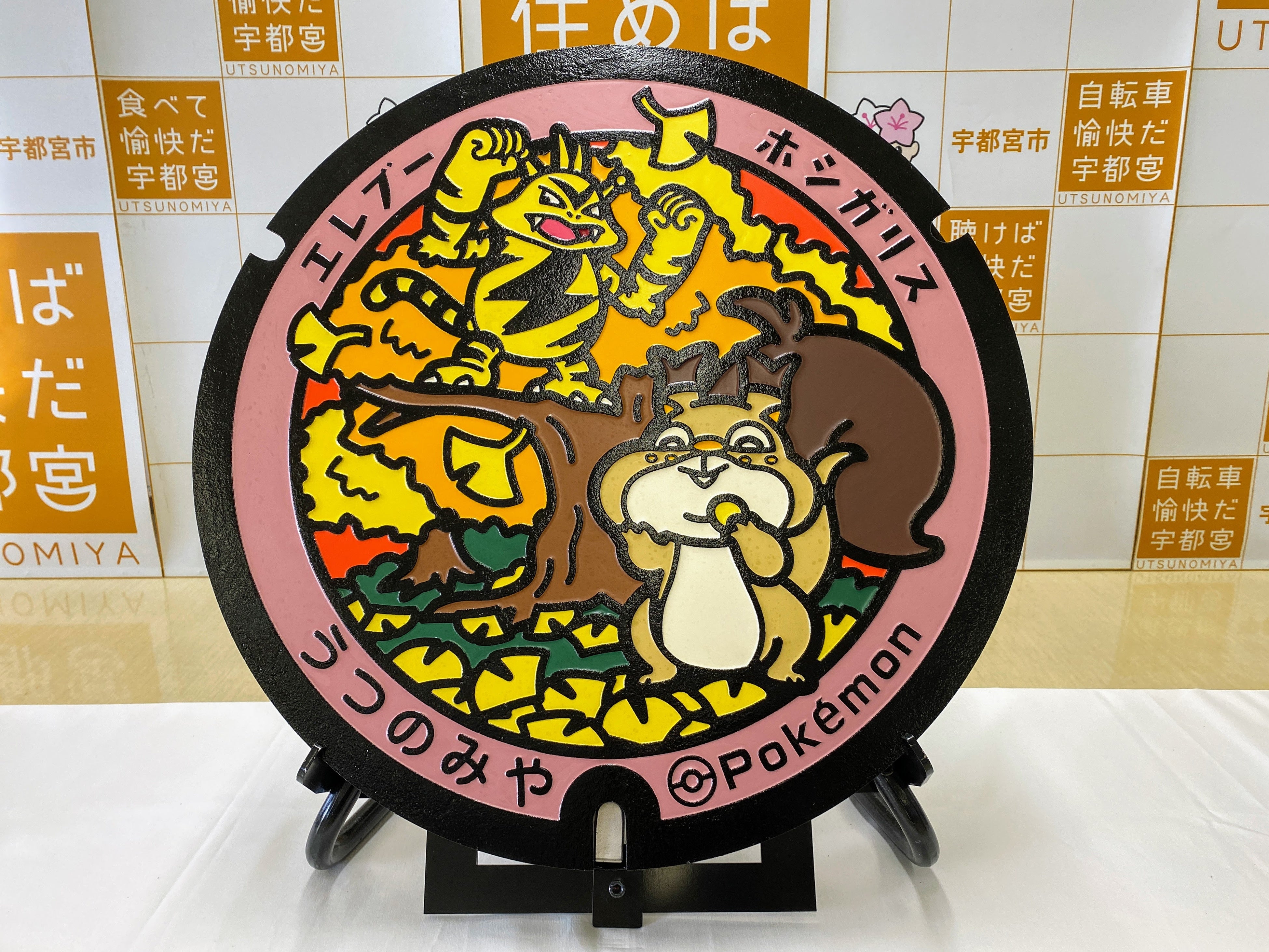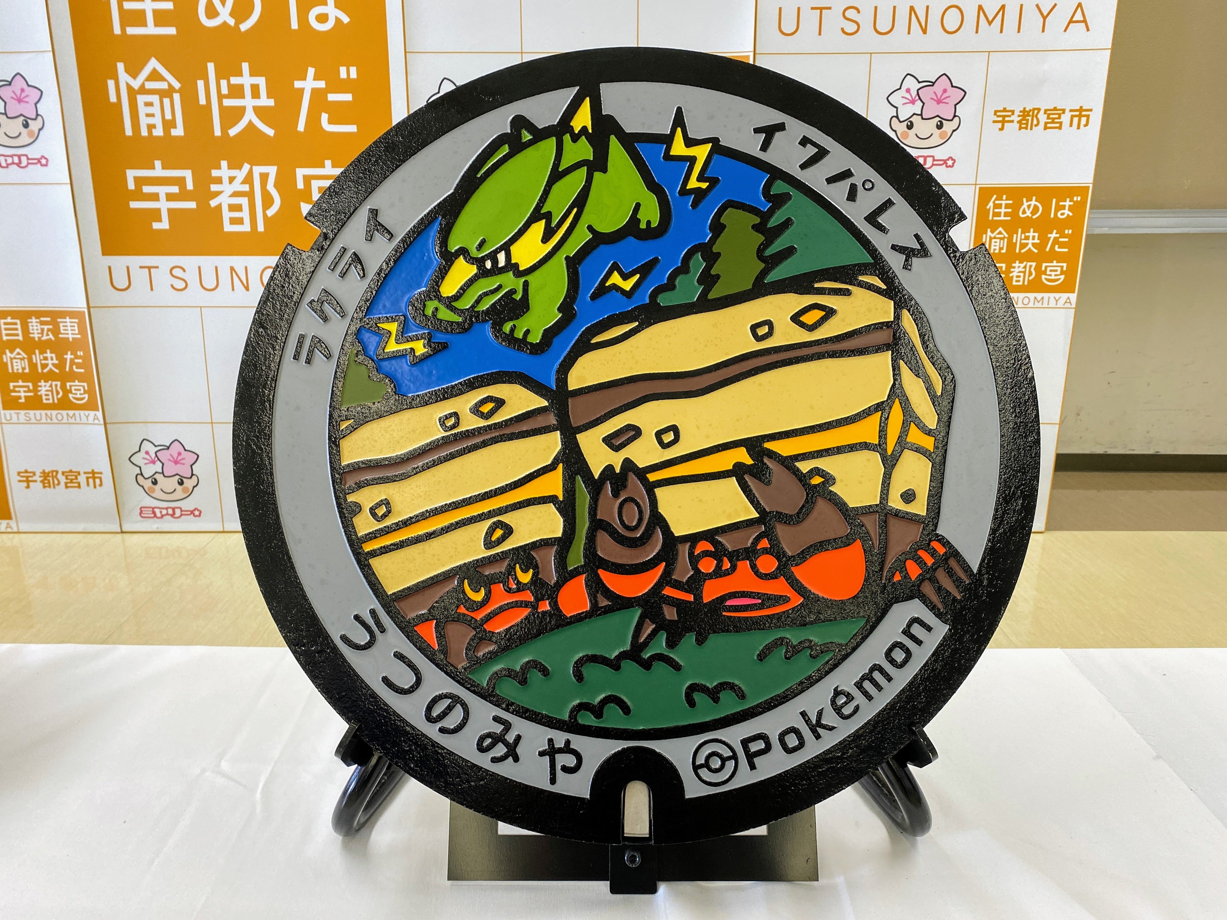 今回、お披露目された3枚の『ポケふた』には、エレブーとホシガリス、ラクライとイワパレス、ボルトロスが、宇都宮市のさまざまな景観をイメージして描かれており、それぞれ市内へ設置してまいります。