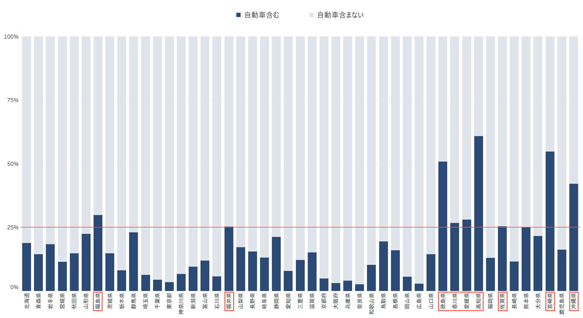 車を利用するプランが25%以上を占めるのが、福島、福井、徳島、香川、愛媛、高知、佐賀、宮崎、沖縄の9県で、高知は約60%となっています。