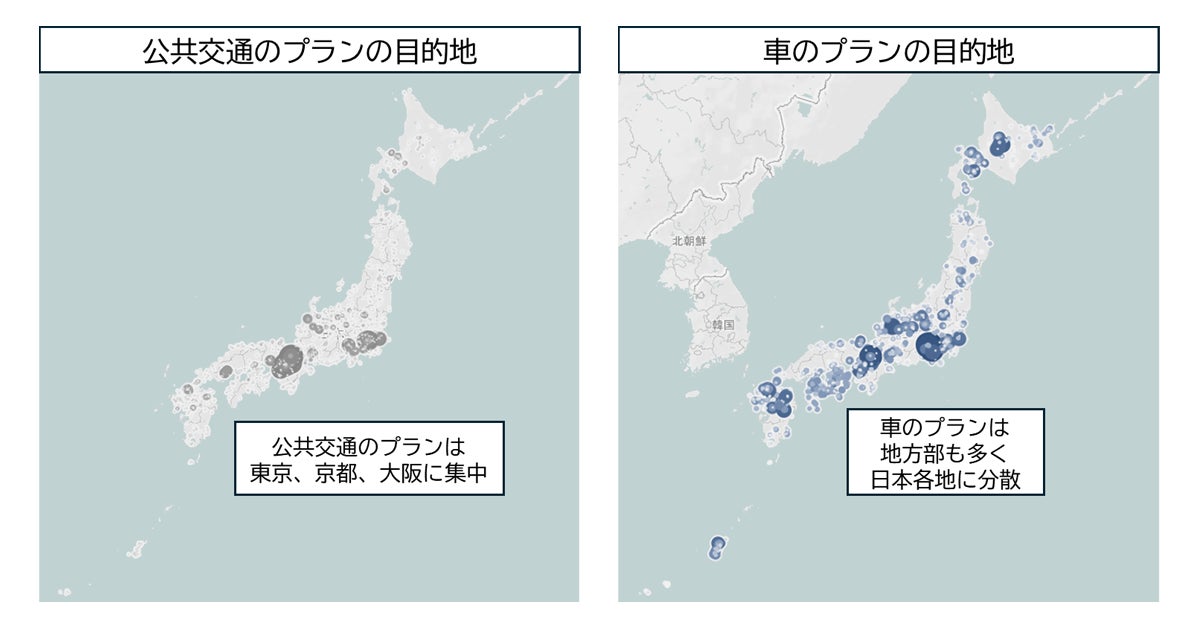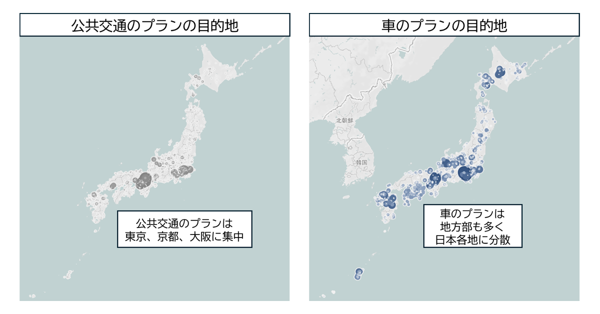 公共交通のプランは東京、京都、大阪に集中しており、車のプランは地方部も多く、日本各地に分散していることがわかります。