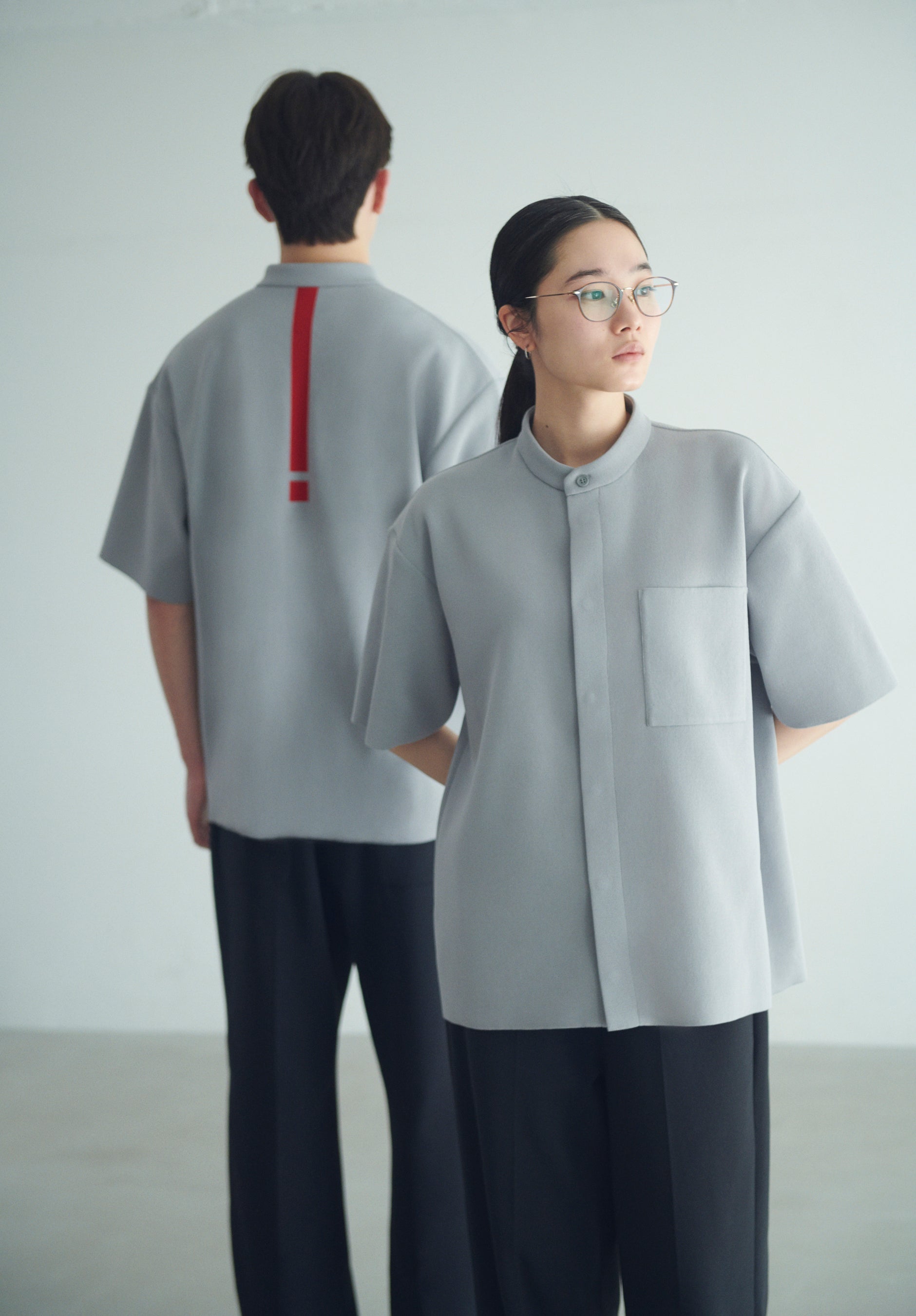 店舗スタッフのユニフォームはCFCLが制作。「現代を生きる人々の道具としての衣服」という視点でニットウエアを提案するCFCLとの対話によって生まれた、本店舗限定のユニフォームは日本製でトレーサビリティが確保されています。冬服はロングジャケット、夏服はハーフスリーブシャツを採用。グレーをベースに背中にはJINSのロゴを象徴する赤い「!」マークを配し、本店舗にふさわしい品格や信頼性とスタッフの動きに配慮した機能性を両立しました。