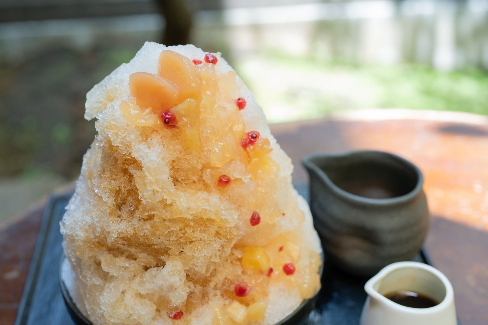 江戸の面影が残る亀戸天神前本店の中庭。木々の揺れる音を聞きながら、香り豊かなほうじ茶ソース、みずみずしい桃、そして氷のふわふわ食感をご堪能いただけます。