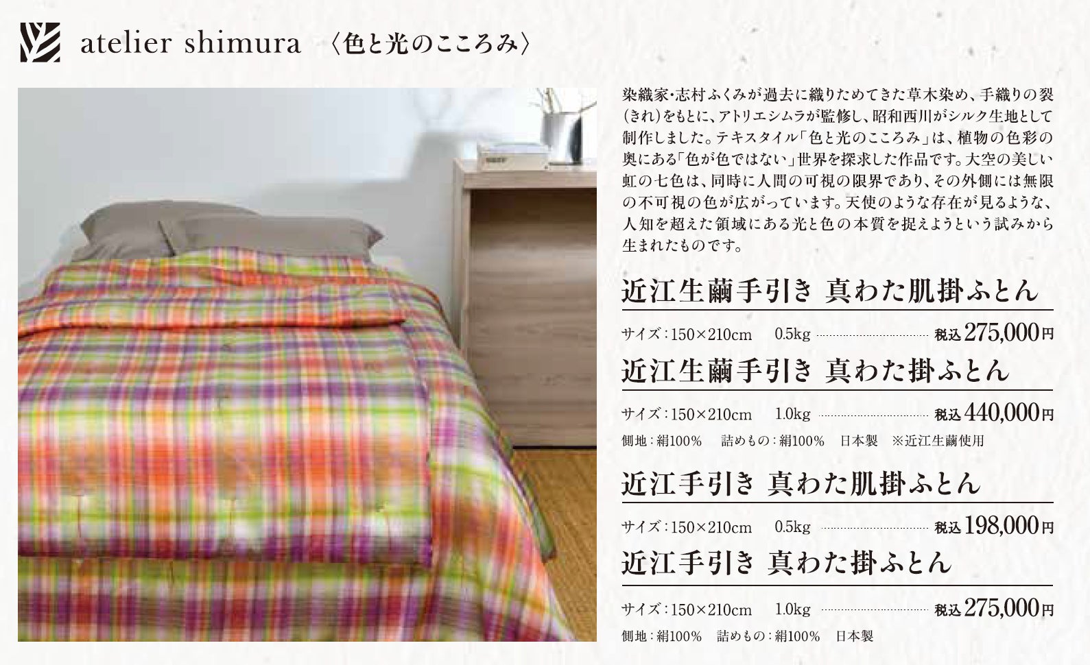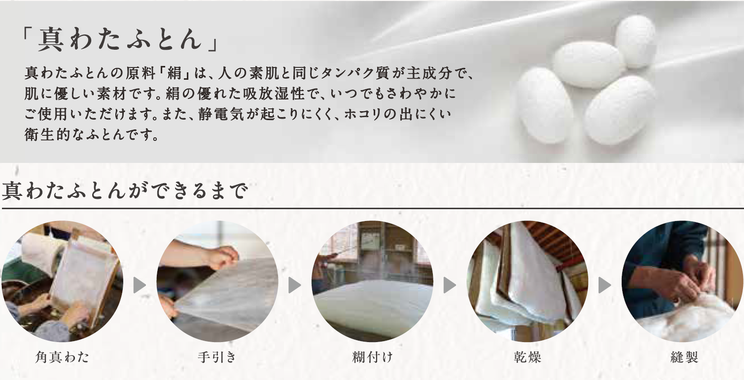 真わたは吸湿・放湿性に優れ、就寝中の湿気を速やかに逃がす特長を持っています。気温が上がり、汗ばむことが増えるこれからの季節に快適な睡眠環境を支える素材です。会場では熟練職人が繭の角わたを丁寧に引き伸ばし、幾重にも空気の層を重ねる“手引き”を実演。手仕事ならではの驚くほど軽やかで、しなやかな質感をご体感いただけます。