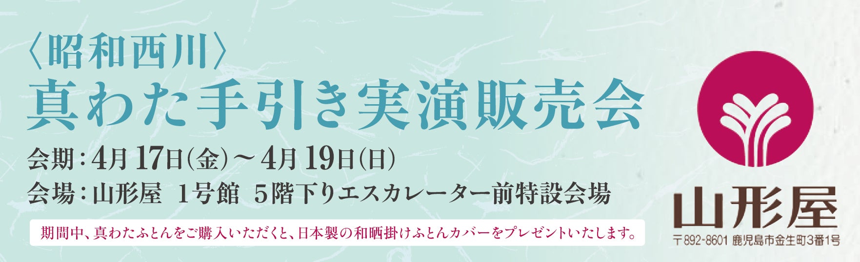 昭和西川株式会社(所在地:東京都中央区、代表:西川元一朗)は2026年4月17日(金)から19日(日)までの3日間、鹿児島山形屋1号館5階の特設会場(下りエスカレーター前)にて真わたふとんの魅力を伝える「真わた手引き実演販売会」を開催いたします。