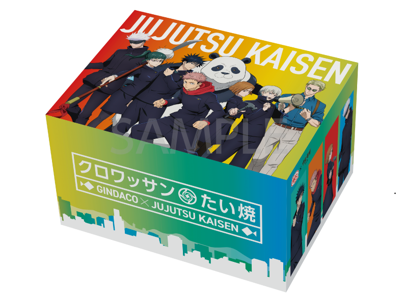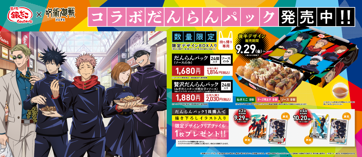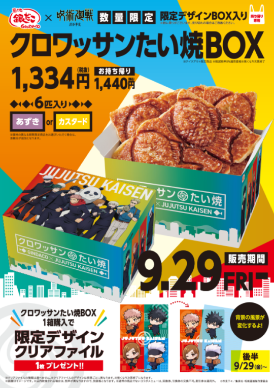 今回のコラボレーションでは、渋谷事変の登場キャラクターの七海建人や伏黒恵をイメージした 『コラボたこ焼(8個入り)、特製スリーブ、限定コラボカード付』 や、オリジナルデザイン 『だんらんパック(24個入り)、限定デザインクリアファイル付』 に加え、新たにオリジナルデザイン 『クロワッサンたい焼BOX(6匹入り)、限定デザインクリアファイル付』 の販売や各種宅配サービス利用で 『ミニクリアファイルのプレゼントキャンペーン』 を実施いたします。