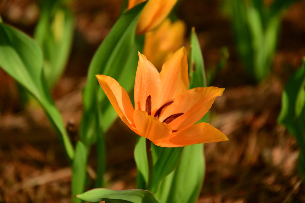 鮮やかな朱赤色の花が特徴の原種系のチューリップで、背丈は低めながら存在感のある花姿となっています。1株から複数の花を咲かせることもあり、見頃を迎えるとまるで炎のように花畑を彩ります。